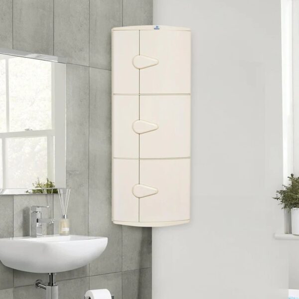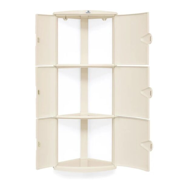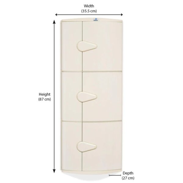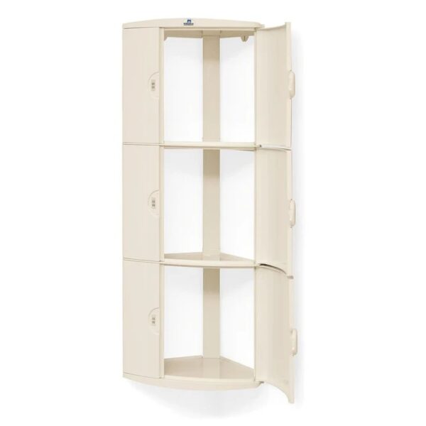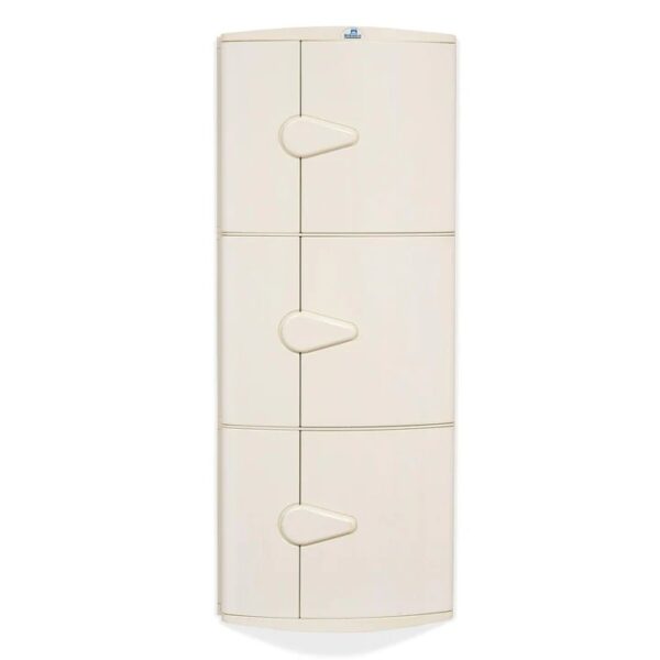 Need a modern cabinet to neatly store essentials in a corner? The thoughtfully designed Nilkamal 3-Door Corner Cabinet is for you. Its sturdy plastic construction in a clean, curved design fits into the corners of bathrooms, dressing rooms, and office spaces. With a three-tiered door cabinet, you get enough space to keep essentials handy while keeping your room looking nice. If your room requires an attractive corner cabinet, this is it.