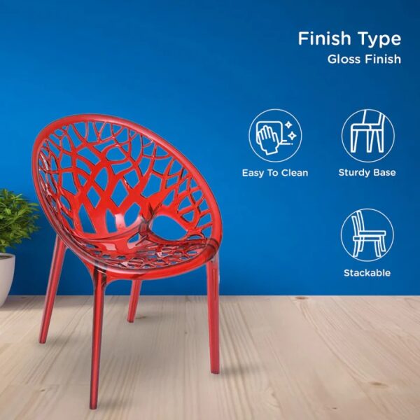 Unwind with the comfortable ergonomics and stylish design of the Crystal Armless Chair. The durable virgin plastic construction in a gloss finish makes this chair last for years while maintaining its appeal. The 110-kg load-bearing capacity ensures secure sitting. Because of its sturdy construction and charming aesthetics, the Crystal Armless Chair is suitable for living rooms, offices, cafes, and gardens. Always have a relaxing seat available for you and your guests with the Crystal Chair.