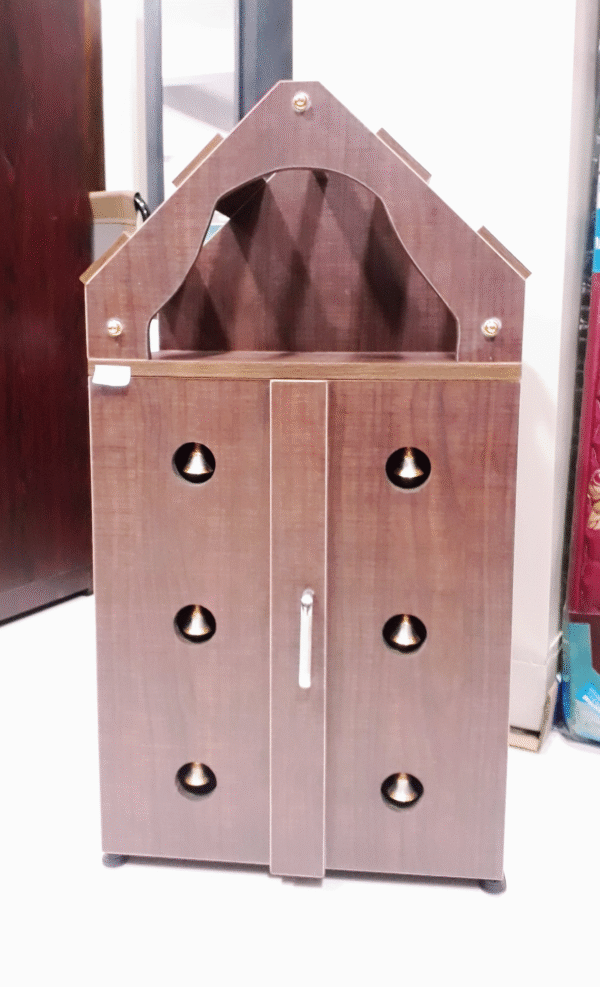 Pooja Stand, medium, brown colour made of particle board locally manufactured.